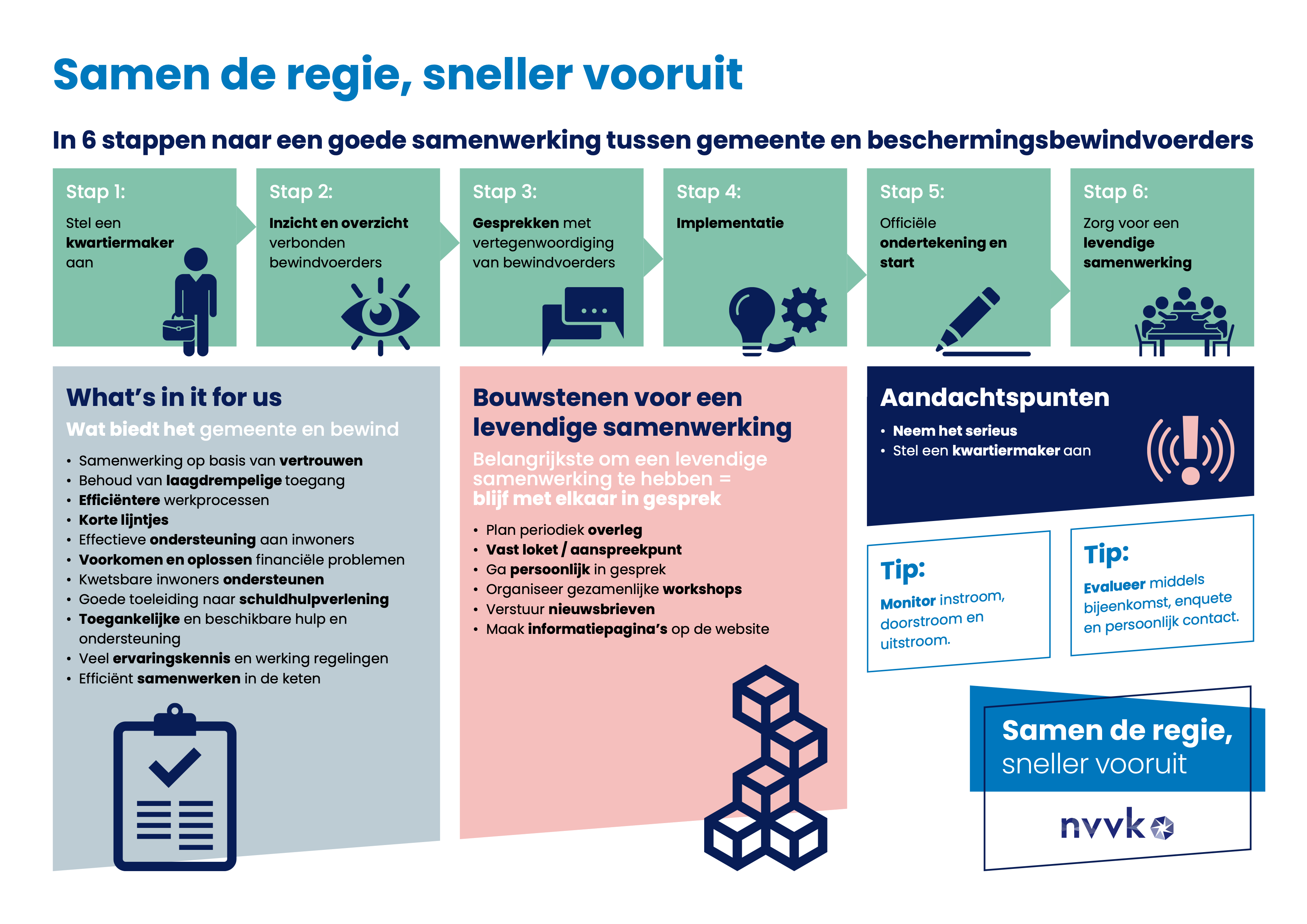 De modelovereenkomst Gemeente en Bewind (samen de regie) biedt een praktisch kader voor samenwerking tussen gemeenten en bewindvoerders. De bijbehorende handreiking biedt praktische uitleg en ondersteuning. De overeenkomst en handreiking zijn ontwikkeld door de NVVK in samenwerking met VNG, HORUS en NBBI.